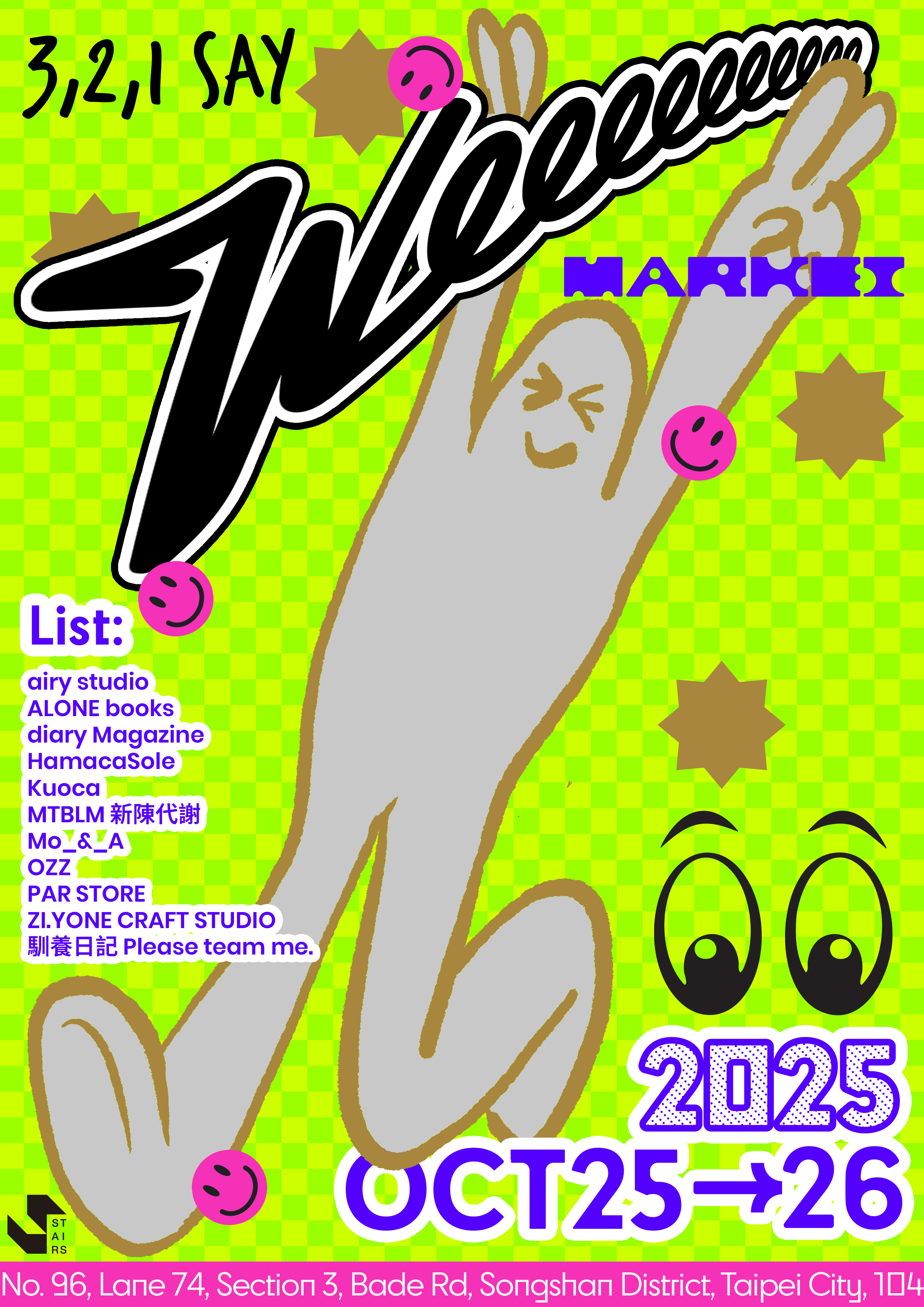 Stairs SpaceWeeeeee Market 10/25–10/26 週末登場!11 組品牌齊聚 Stairs Space,一起 Say Weeeeee!被生活節奏推著前進的週間,假日就該盡情放鬆。10月25日(六)至10月26日(日),為期兩天的 Weeeeee Market 將在台北松山區 Stairs Space 登場。這場由 Stairs Space 與 Airy Studio 共同策劃的週末市集,集結我們身邊最喜歡、也最有才華的朋友與品牌。從選物、書到氣味,每個角落都充滿細膩與驚喜。We 不只是「我們」,也是一個不分任何人都能來享樂的空間。在這裡,每個人都能找到屬於自己的開心理由。Read more